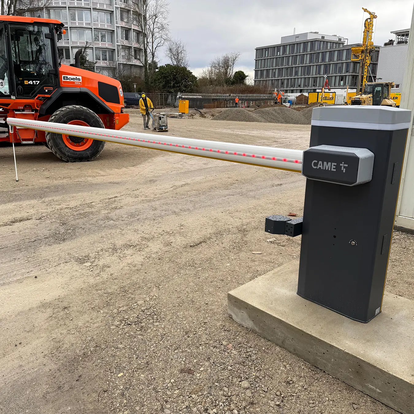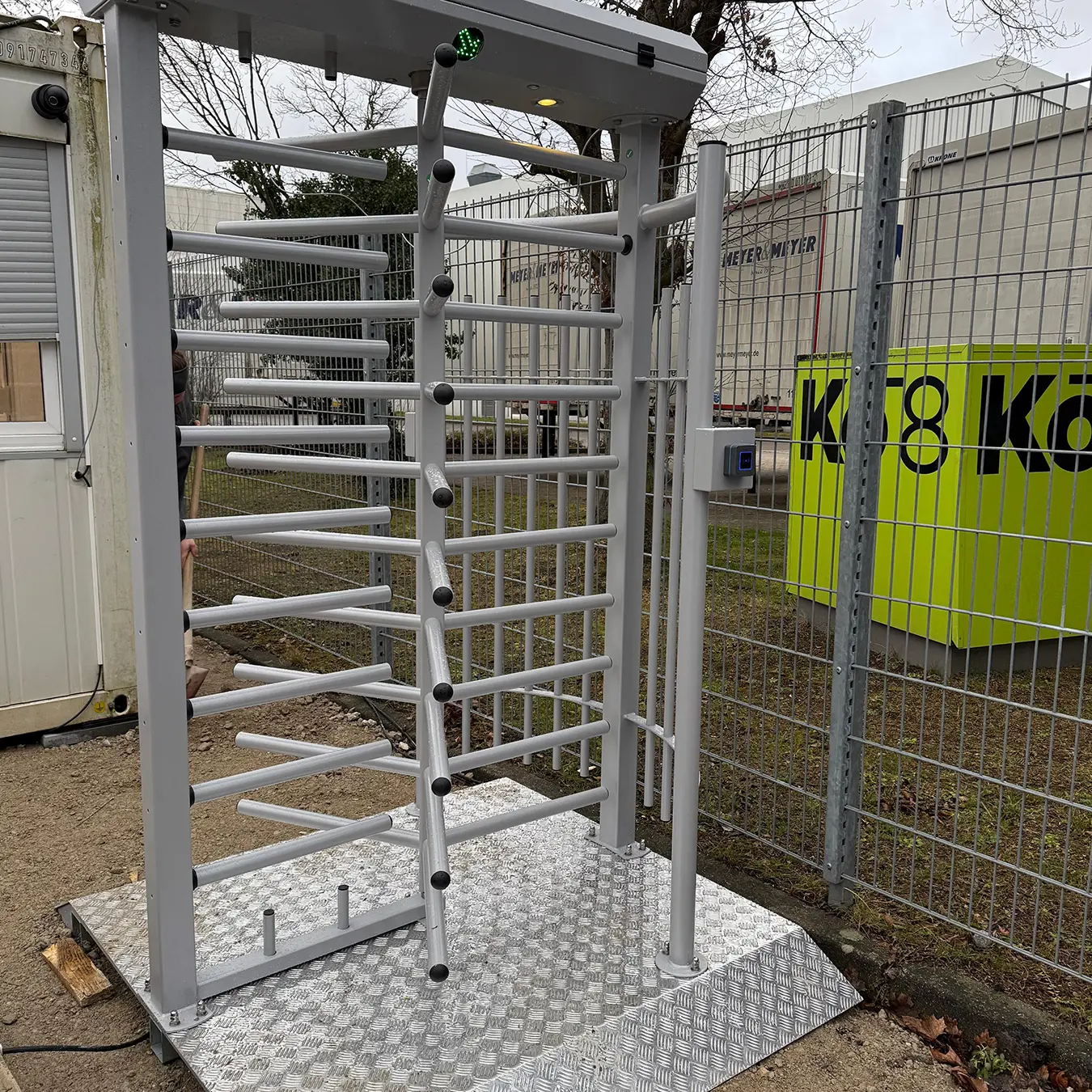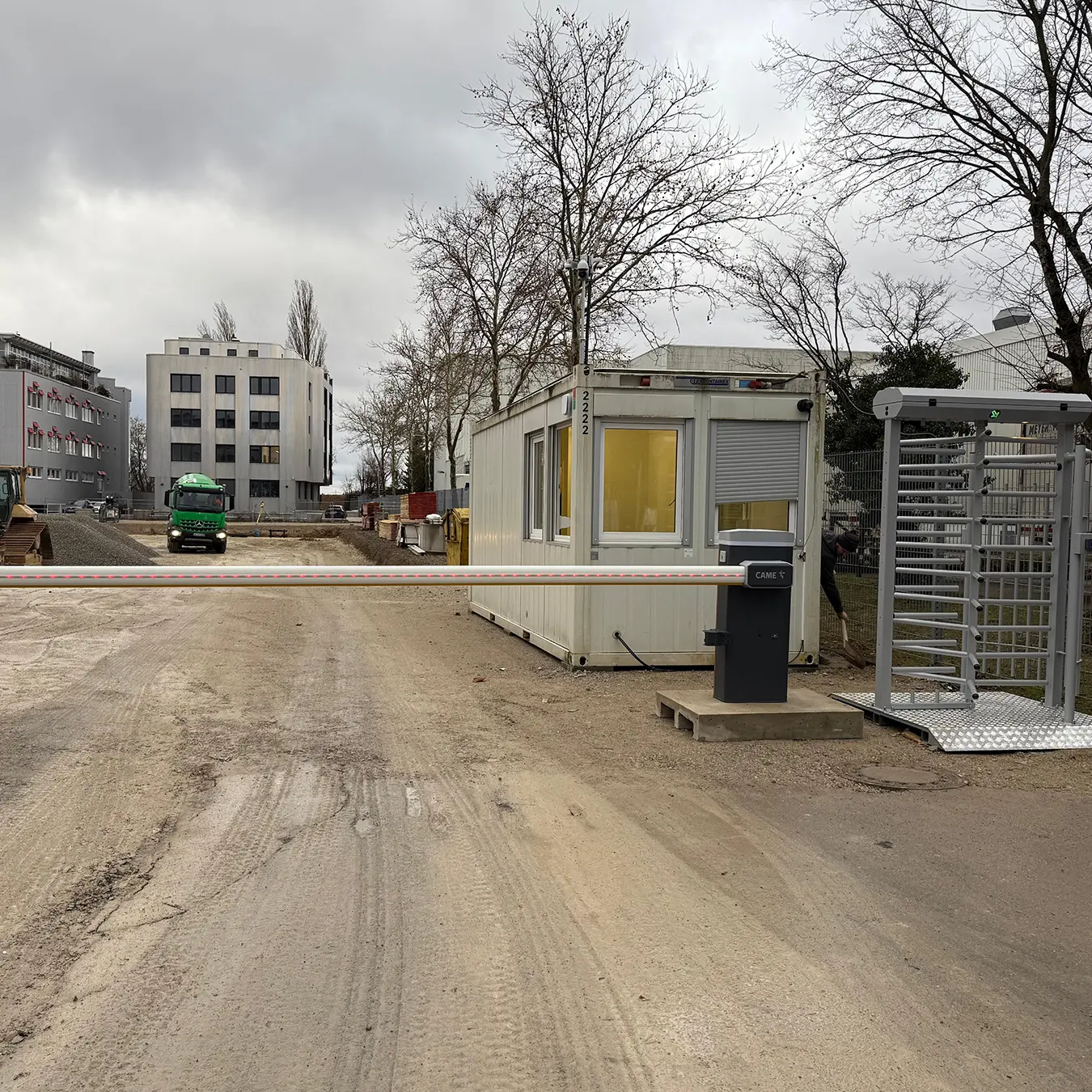 Die Baustelleneinrichtung umfasst: Zutrittskontrolle per Drehkreuz und Fahrzeugschranke, Stellung Büro und Materialcontainer, Baustellenüberwachung, Stellung Sicherheitspersonal, Bereitstellung Baustrom, Bauwasser, Bauzaun und Baugerüst.
